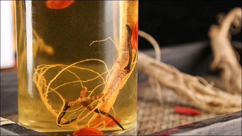 Đông trùng hạ thảo ngâm rượu không chỉ là một món ngon mà còn mang lại nhiều lợi ích cho sức khỏe. Để thực hiện, bạn cần chuẩn bị 15g đông trùng hạ thảo khô, 20g táo đỏ khô, cùng 1 lít rượu trắng nồng độ 40 độ và một bình thủy tinh sạch. Sau khi rửa sạch nguyên liệu, bạn chỉ cần cho tất cả vào bình rồi đổ rượu lên. Đậy kín nắp và để ngâm từ 15 ngày trở lên.