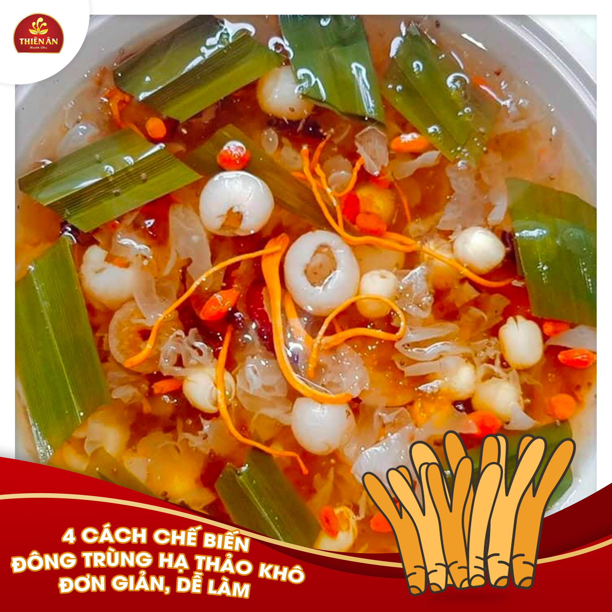Ngoài ra, bạn cũng có thể pha trà với đông trùng hạ thảo khô. Chỉ cần cho 3-7g vào bình trà, thêm 200ml nước sôi, chờ khoảng 10-15 phút để tinh chất hòa vào nước. Đồ uống này không chỉ ngon mà còn rất tốt cho sức khỏe.