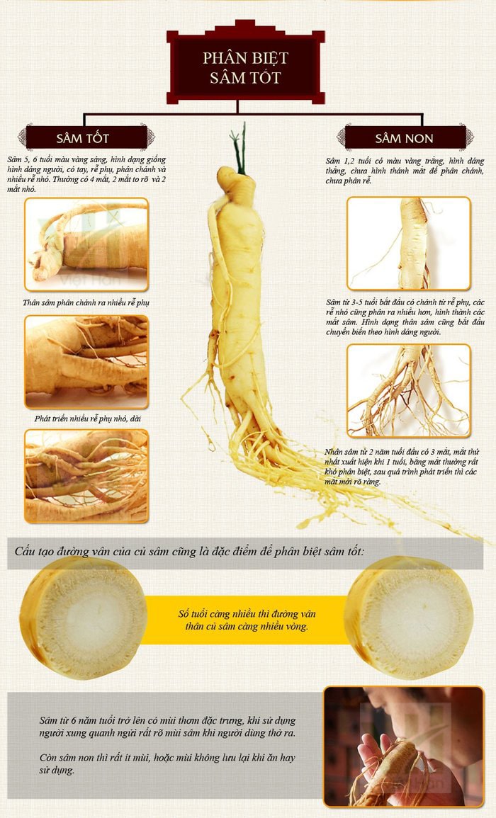 Nhân sâm Hàn Quốc nổi tiếng với nhiều tác dụng quý giá đối với sức khỏe, đặc biệt là những củ sâm có tuổi đời cao. Tuy nhiên, không phải ai cũng biết cách nhận biết và phân biệt độ tuổi của sâm để tránh mua phải hàng kém chất lượng hoặc bị làm giả. Bài viết dưới đây sẽ hướng dẫn bạn các cách nhận biết tuổi sâm Hàn Quốc thông qua hình dạng bên ngoài, số đốt trên rễ và thân, màu sắc, độ ẩm, cân nặng, kích thước… Ngoài ra, chúng tôi còn chia sẻ những lưu ý giúp bạn chọn mua đúng nhân sâm Hàn Quốc chất lượng, tránh gặp phải hàng nhái trên thị trường.