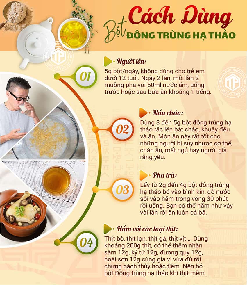 Đông trùng hạ thảo dạng bột là một sản phẩm hữu ích cho sức khỏe mà nhiều người đang ưa chuộng. Để sử dụng, bạn chỉ cần hòa tan 1-2g bột (tương đương 1/2 – 1 thìa cà phê) vào 100-150ml nước ấm khoảng 40-60 độ C. Ngoài ra, bạn cũng có thể ngâm 5-7 sợi đông trùng hạ thảo khô trong khoảng 500ml nước ấm và để nguội để sử dụng như một loại nước uống thông thường.