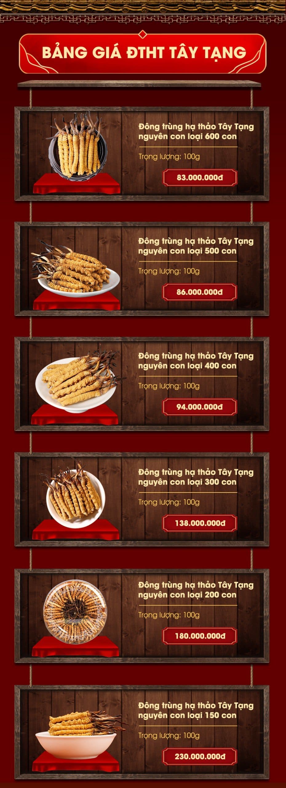 Về giá cả, đông trùng hạ thảo Tây Tạng được phân loại thành nhiều mức giá khác nhau. Những loại phổ thông như 22 con/10g có giá khoảng 16 triệu đồng, trong khi những sản phẩm vip hơn, như 14 con/10g có giá lên đến 28 triệu đồng. Đặc biệt, loại từ 200 con đến 600 con mỗi lạng có giá từ 70 triệu đến 120 triệu đồng, một mức giá cho thấy giá trị của loại thảo dược này.