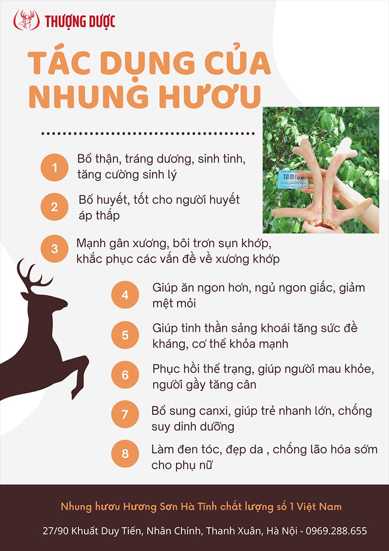 Ngoài ra, nhung hươu còn tích cực kích thích cảm giác thèm ăn, tăng cường hệ miễn dịch, đồng thời giúp phát triển chiều cao và cân nặng cho trẻ em. Với những tác dụng kỳ diệu như vậy, nhung hươu thực sự xứng đáng được coi là “thượng dược” cho sức khỏe của mỗi người.