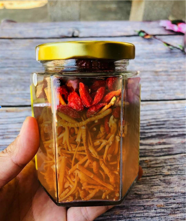Ngâm đông trùng hạ thảo với mật ong là một cách thưởng thức và tận dụng những lợi ích sức khỏe tuyệt vời từ hai nguyên liệu này. Để thực hiện, bạn cần chuẩn bị 100g đông trùng hạ thảo tươi và 1 lít mật ong tự nhiên. Sau khi rửa sạch đông trùng, cho vào bình thủy tinh và đổ mật ong vào sao cho ngập mặt nấm, rồi đậy nắp kín.