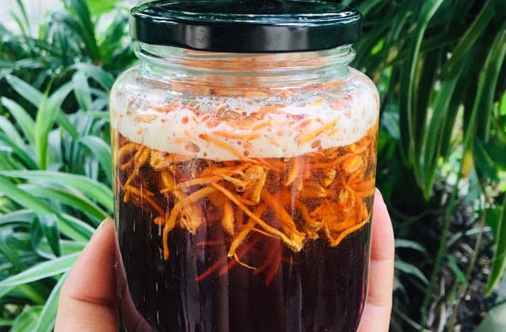 Trước khi ngâm, hãy rửa sạch cả đông trùng hạ thảo và hũ thủy tinh thật kỹ, sau đó để ráo nước. Bạn cho đông trùng hạ thảo vào hũ rồi từ từ đổ 1 lít mật ong vào. Đậy kín nắp và sau khoảng 7-10 ngày, sản phẩm sẽ lên men và có thể dùng được.