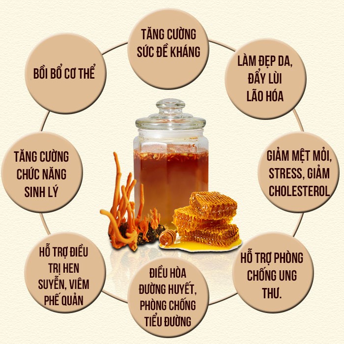 Ngoài ra, bạn cũng có thể kết hợp đông trùng hạ thảo với mật ong. Chỉ cần cho 15g đông trùng hạ thảo khô vào 0,5l mật ong nguyên chất, đậy kín và để khoảng 15-20 ngày. Mật ong sẽ thấm đều vào đông trùng, tạo thành một sản phẩm bổ dưỡng. Mỗi ngày, bạn có thể dùng 1 muỗng mật ong cùng một ít đông trùng hạ thảo để tăng cường sức đề kháng.