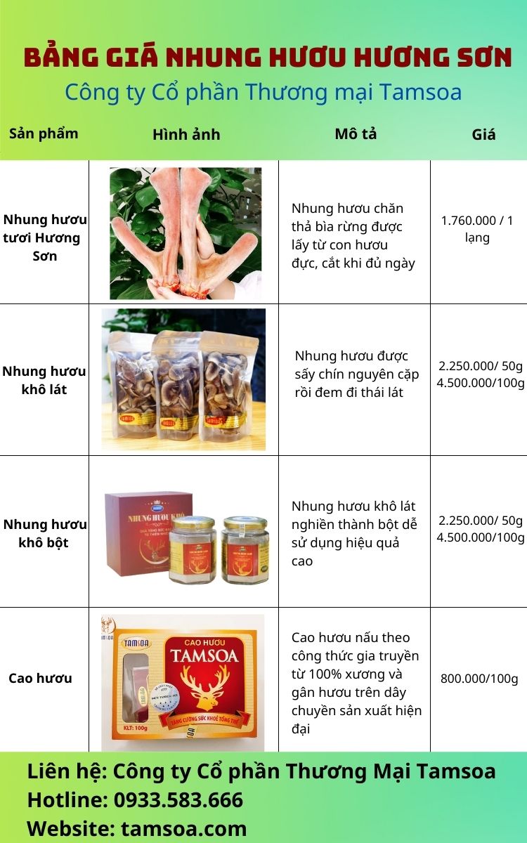 Những ai tìm mua nhung hươu cần chú ý rằng giá cũng phụ thuộc vào độ tuổi và khối lượng của hươu. Một cặp nhung hươu tươi có thể nặng từ 3 đến 8 lạng, và giá cả có thể lên đến 12.5 triệu đồng/kg. Nếu bạn muốn tìm những sản phẩm nhung hươu chất lượng với giá tốt, hãy ghé thăm các cửa hàng uy tín như Nông sản Dũng Hà tại Hà Nội và TP.HCM nhé!