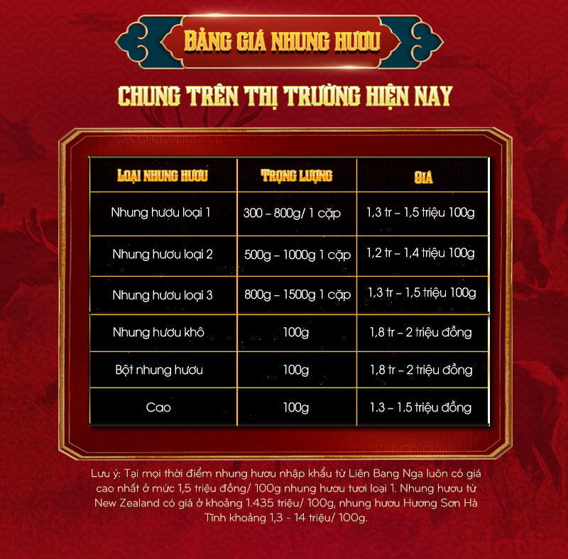 Đặc biệt, nhung hươu khai thác từ Siberia nổi tiếng quý hiếm do điều kiện chăn nuôi tự nhiên và hươu thường to khỏe hơn. Nhìn chung, giá nhung hươu khô từ các shop kinh doanh dao động từ 500.000 ₫ đến 1.000.000 ₫, cho thấy mức độ cạnh tranh cao trên thị trường.
