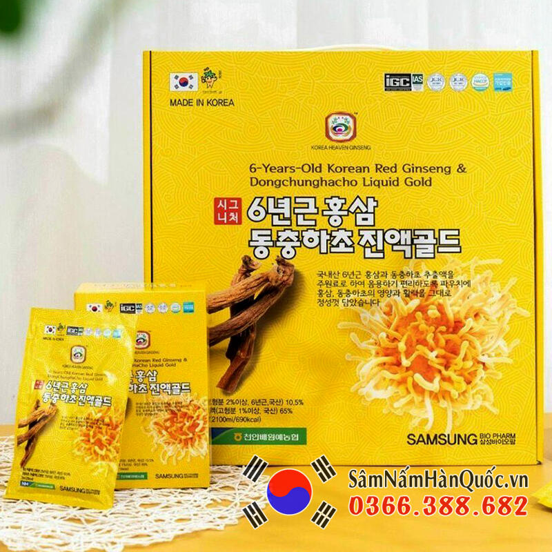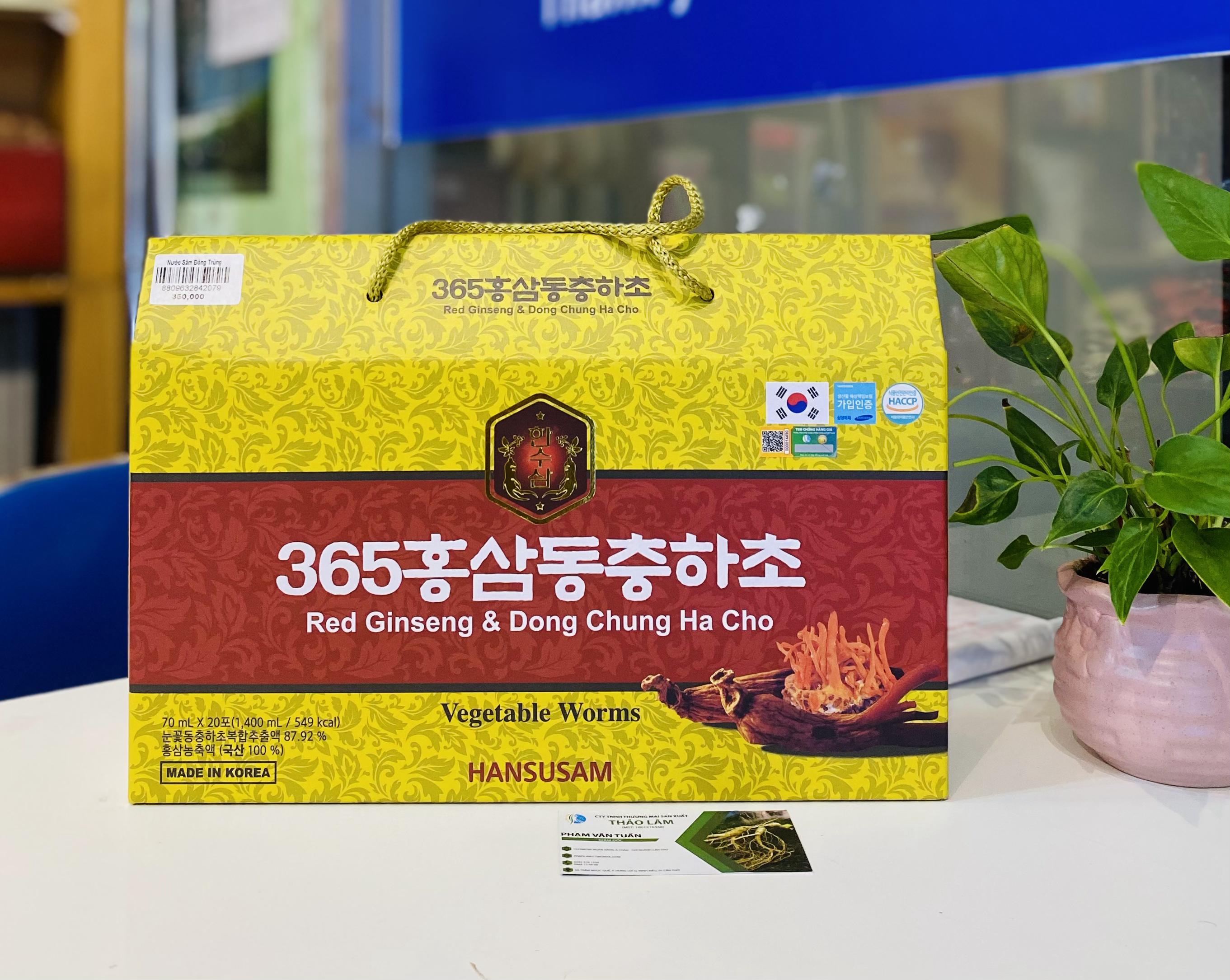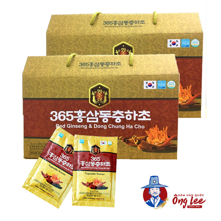 Một trong những sản phẩm nổi bật là Nước Chiết Xuất Hồng Sâm Đông Trùng Hạ Thảo 365 với 20 gói x 70ml. Sản phẩm này được sản xuất dưới công nghệ hiện đại của Gaesung Sang In, kết hợp tinh tế giữa hồng sâm và đông trùng hạ thảo.