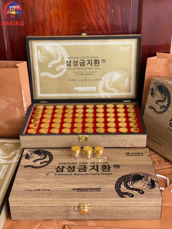 Sản phẩm được đóng gói trong hộp gỗ sang trọng với 60 viên, mỗi viên nặng 3.75g, đảm bảo chất lượng và an toàn khi sử dụng. Điều đáng chú ý là giá cả của Samsung Gum Jee Hwan rất phải chăng, chỉ từ 480.000 đồng cho một hộp chính ngạch, giúp bạn dễ dàng tiếp cận hơn.