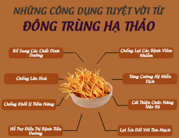 Ngoài ra, đông trùng hạ thảo còn hỗ trợ chức năng gan và thận, cải thiện tuần hoàn máu, giúp cơ thể trở nên khỏe mạnh hơn. Đặc biệt, với hàm lượng vitamin phong phú và các nguyên tố vi lượng như selen, loại thảo dược này có tác dụng chống oxy hóa, làm chậm quá trình lão hóa và giảm đau nhức xương khớp một cách hiệu quả.