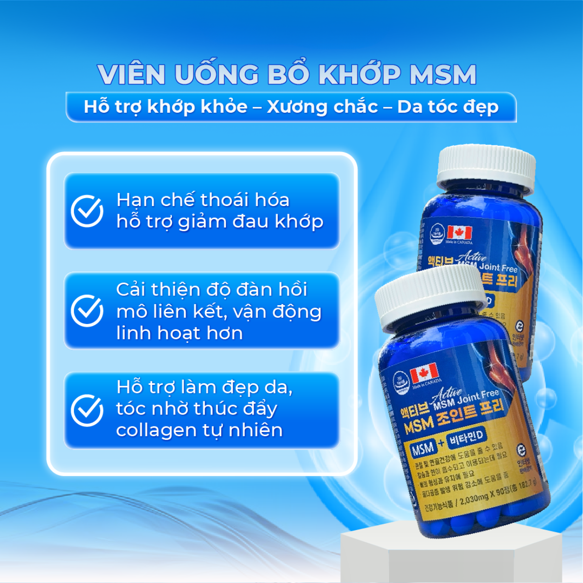 Ngoài việc hỗ trợ làm giảm các triệu chứng đau nhức, sản phẩm còn giúp tái tạo và phục hồi sụn khớp, cải thiện khả năng vận động linh hoạt. Nếu bạn đang tìm kiếm một giải pháp an toàn và hiệu quả cho sức khỏe xương khớp, viên bổ khớp MSM Hàn Quốc thực sự là một lựa chọn đáng để thử.