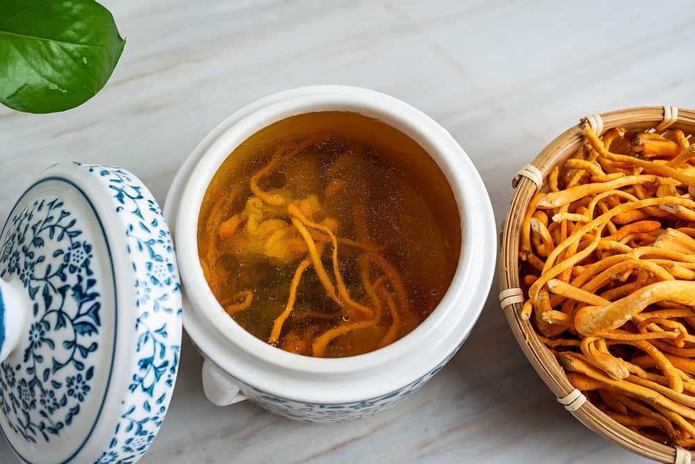Ngoài ra, bạn cũng có thể pha trà đông trùng hạ thảo để thưởng thức. Chỉ cần cho từ 5 – 7 sợi đông trùng vào ấm trà, thêm nước sôi tráng qua và rót khoảng 150ml nước sôi vào. Thời điểm uống trà rất quan trọng; những người mới ốm dậy nên uống vào buổi sáng, trong khi những ai muốn kích thích sự thèm ăn thì nên dùng trước bữa ăn khoảng 30 phút.