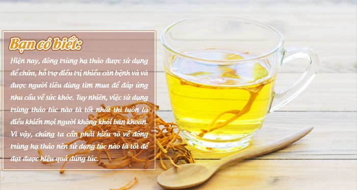 Để tối ưu hóa hiệu quả, bạn nên uống đông trùng hạ thảo vào buổi sáng hoặc chiều, và sử dụng trà đông trùng hạ thảo sau bữa ăn. Mặc dù tác dụng rõ rệt có thể mất vài tháng để cảm nhận, nhưng cơ thể bạn cũng cần thời gian để hấp thụ những dưỡng chất quý giá.